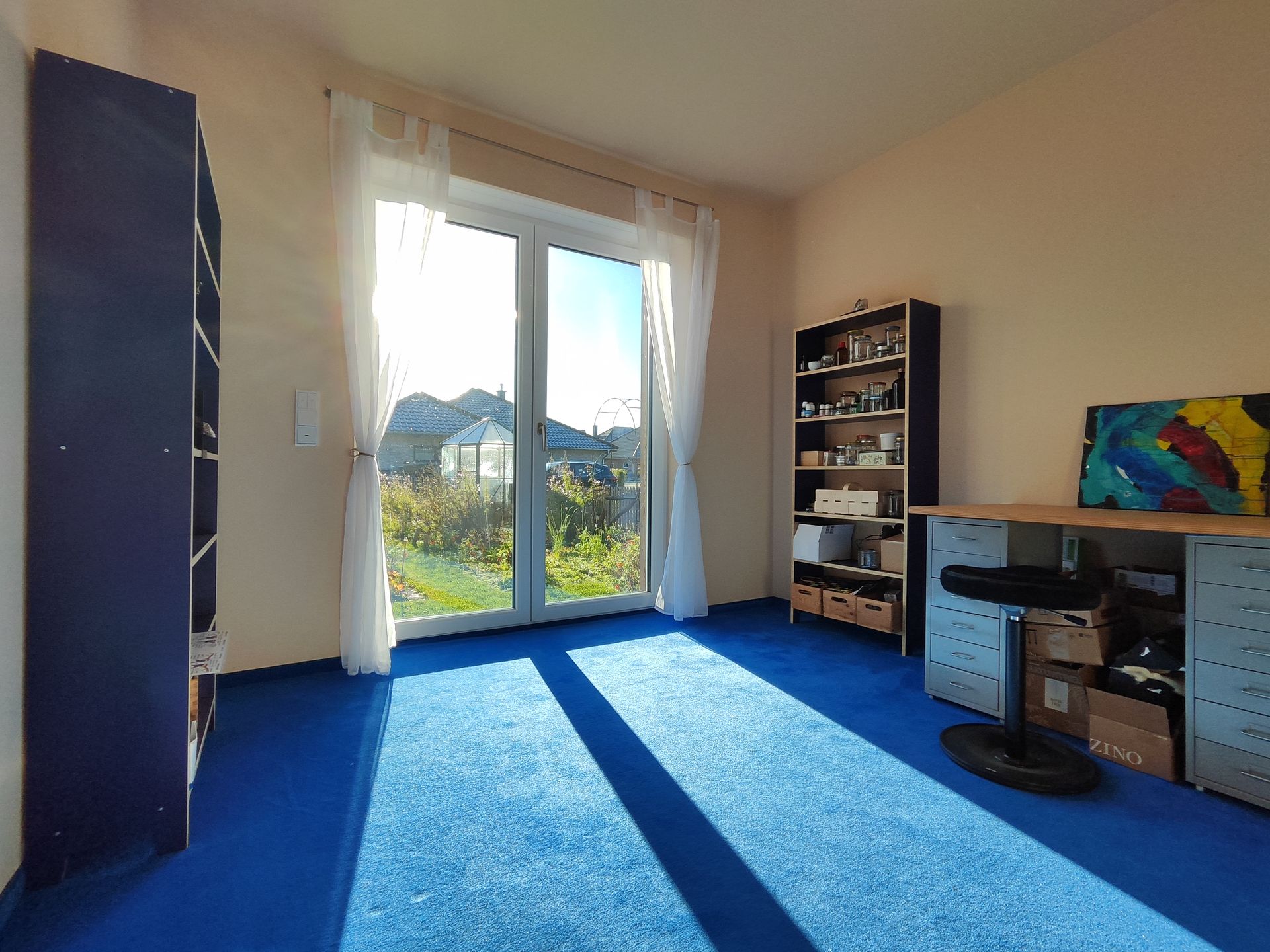Bodenbeläge: Hochwertige gebürstete Eiche im Eingangsbereich sowie im Wohn-Essbereich, Fliesen in Küche und Bädern, blauer Vorwerk-Teppichboden in weiteren Räumen